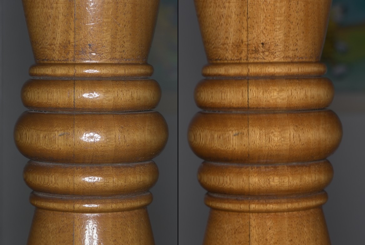 There's another thing that you may have noticed. Some of the wood still looks somewhat shiny, despite the polarisation. I'm not exactly sure when this happens (some tests are in order) but since this wood is painted, there's probably a chance that this acts like a coating. Meaning there are two layers of reflection where only one gets canceled correctly. One more thing that could be an issue is anisotropic spread or scattering due to the fibres in the Wood. I'm not sure how this affects the results. Another likely cause in this case is secondary reflections from the bounced light on the walls left and right to the door.