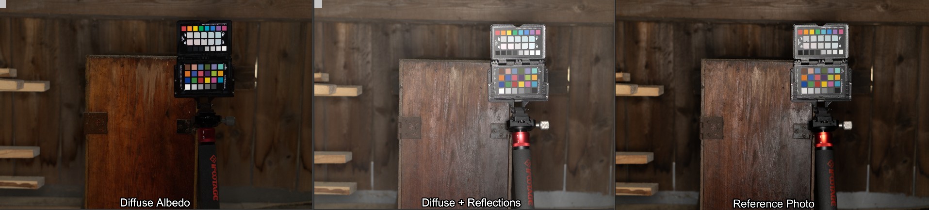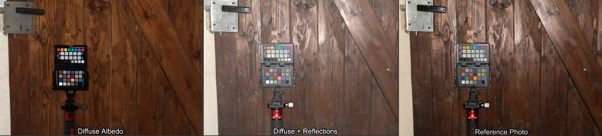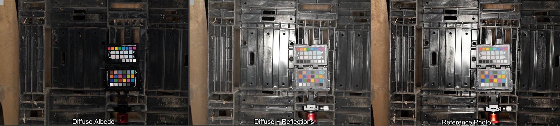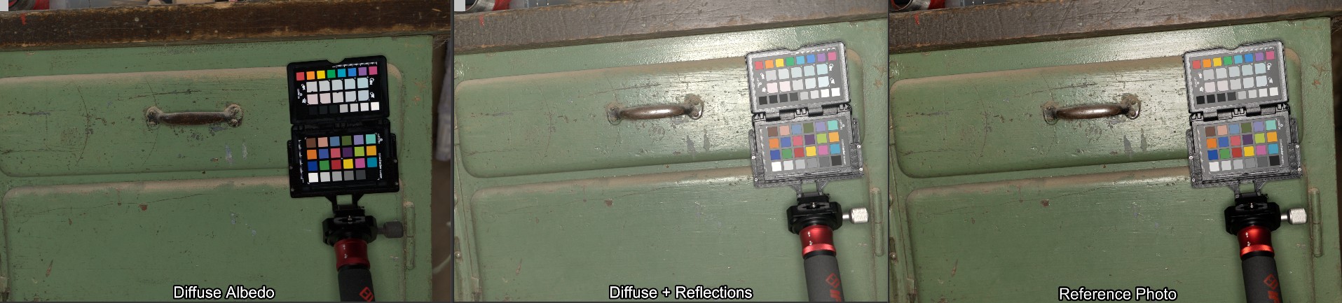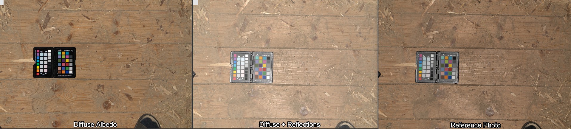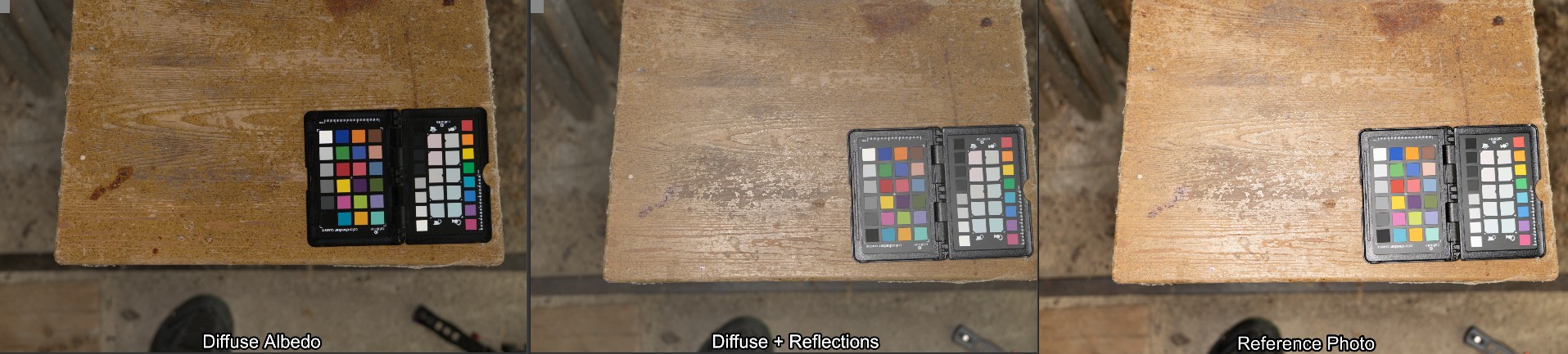 Here are a few examples of the texture and the resulting renderings. The left view is the finished BaseColor texture, the middle one is diffuse + reflections (adjusted for the exposure on the left). You can already see here how much the Reflections contribute to the color - though keep in mind that's while blasting it with a big light source perpendicular to the surface which is basically the worst case. The right view is how the camera took the picture, including tonecurve and no adjustments to the exposure. The point here being that you can not infer a BaseColor texture from a photograph.