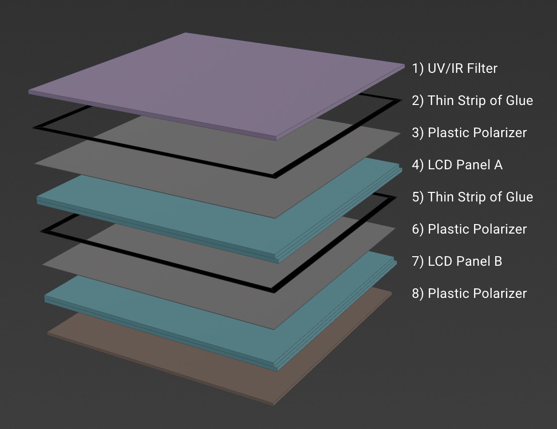 Technically, we could have reached the same result without taking apart the panel completely. In my first tests I only removed 1) and 8). The remaining polarizer sheets will then replace the camera lens filter. Works the same way. This isn't ideal though, as you are running two LCDs, and the additional plastic filters which block more light than necessary. Removing all the layers down to the blank glass will enable us to use our own high quality polarizers and remove as much plastic and glass from the optical path as possible.