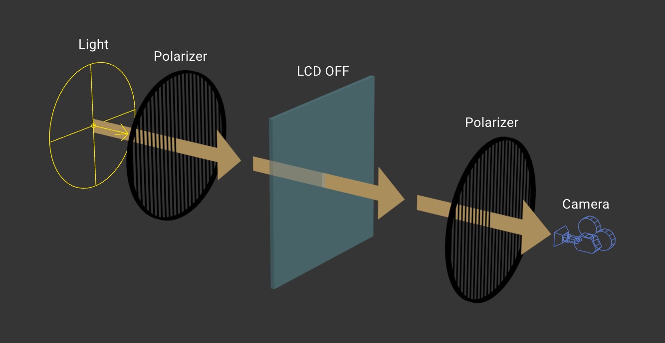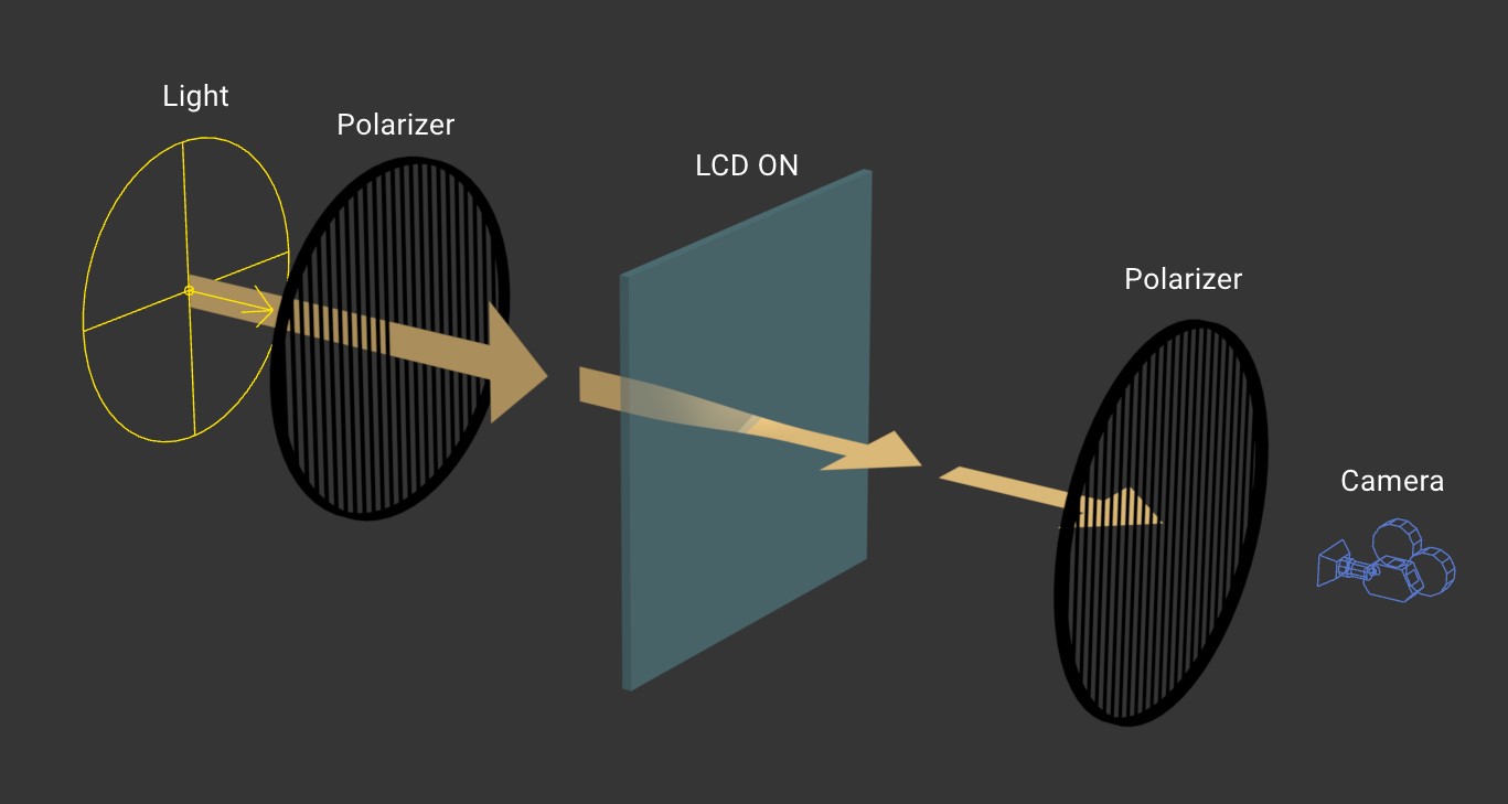 This is going to be the heart of our cross polarisation switching. Since we have removed all the polarizers from the LCD, we need to polarize the lights (as usual) and we need a polarizer in front of the lens. The only thing the LCD does is rotate the polarization of incoming light by 90° if powered. That's the only job the liquid crystals do. If it's off it will just pass-through the light as it is. Once you power it, it will twist the incoming polarized light by 90°. That means we can now switch between parallel and cross polarisation by just powering the LCD on and off.