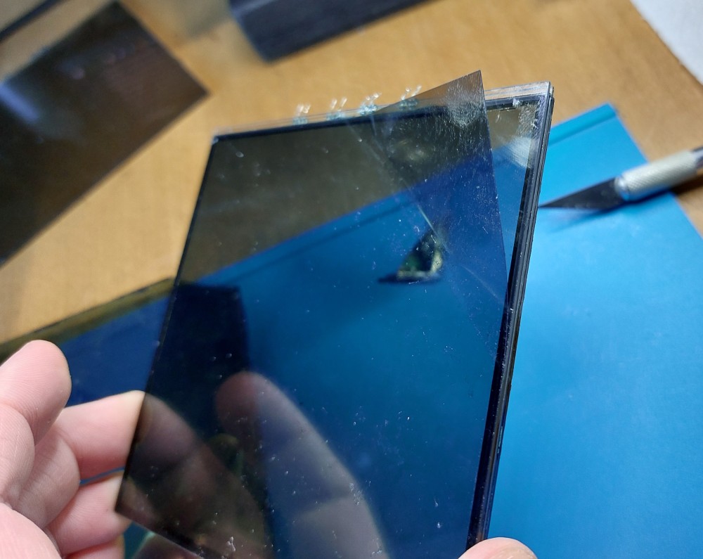 The last piece of the puzzle is the polarizer on the front. For my previous projects I have been using polarization sheets. B+W sells them specifically for photo and video use for a rather hefty price tag, a bit too hefty for my taste. I made some tests and realized that cheap TV polarizer replacement sheets from aliexpress are essentially just as good and comparatively cheap. Apart from being a tiny bit warmer, I could not see or measure and difference from cheap to expensive. The difference in price might be due to heat-resistance or some other non-obvious aspect, I'm not sure.