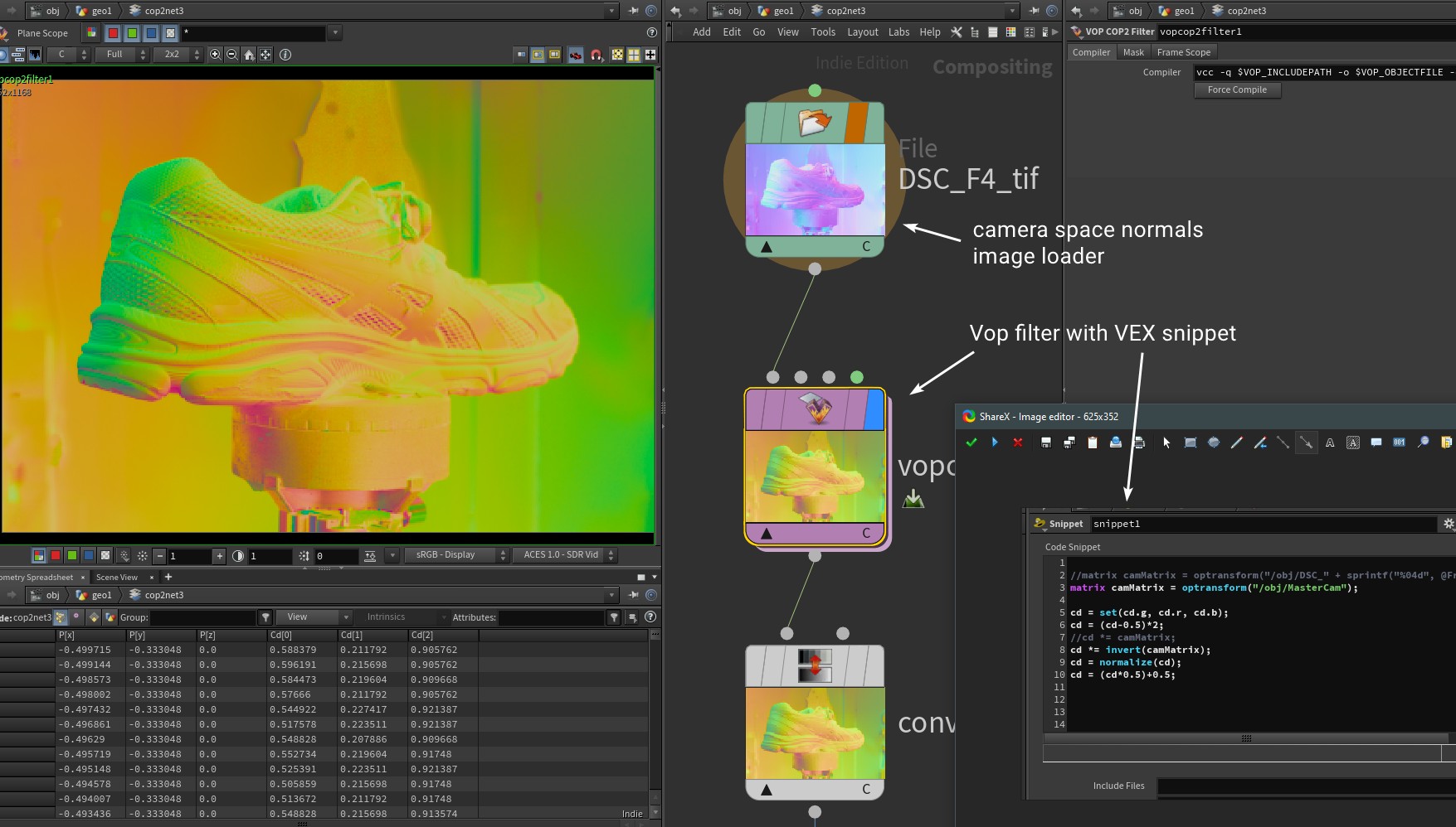 This again, is something that can be done in lots of different ways. In my case, I decided to use houdini for processing. It's probably not the fastest way to do it, but it certainly is one of the easiest. All we really need to do is load the normals images in cops (this was before the new cops was released), load in all the exported cameras, and multiply the screenspace image normals with the inverse of the camera transformation matrix. That's it - or at least I think that's it. I have never really tested it out much more than to a proof of concept state.
