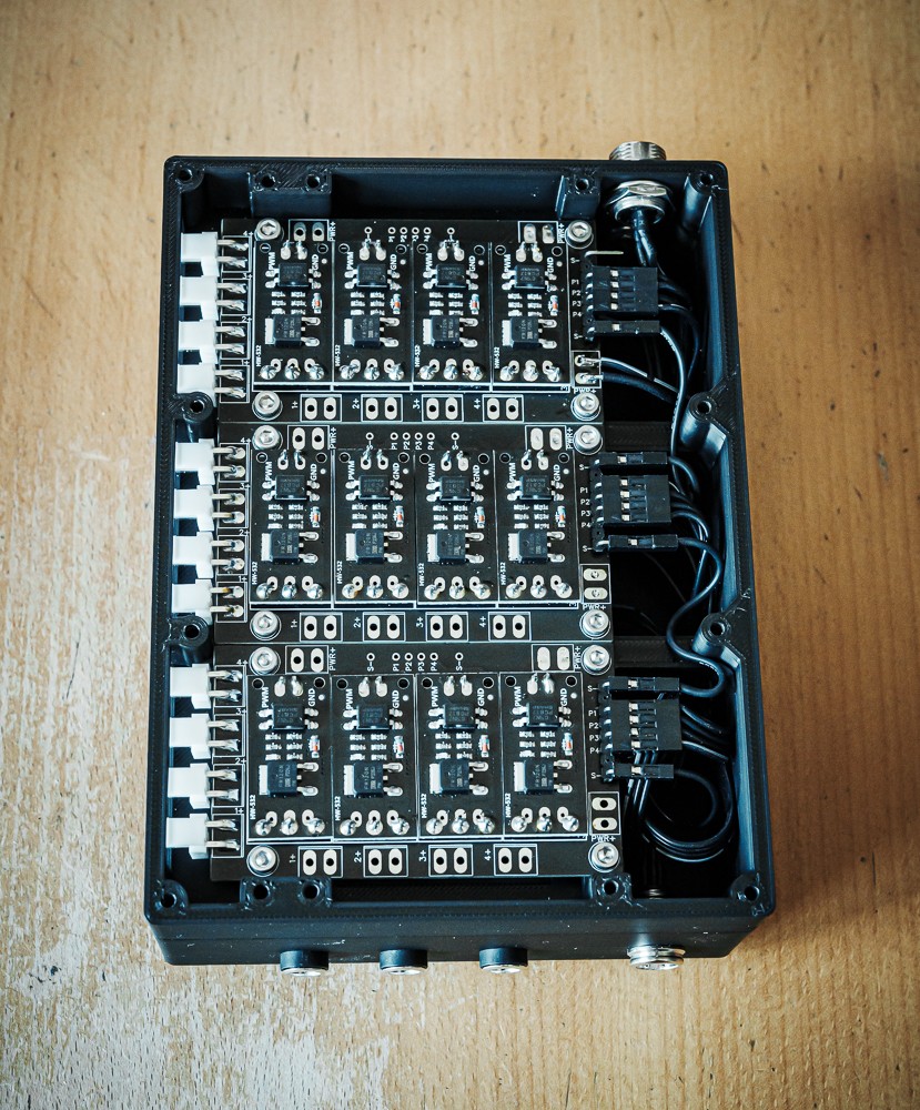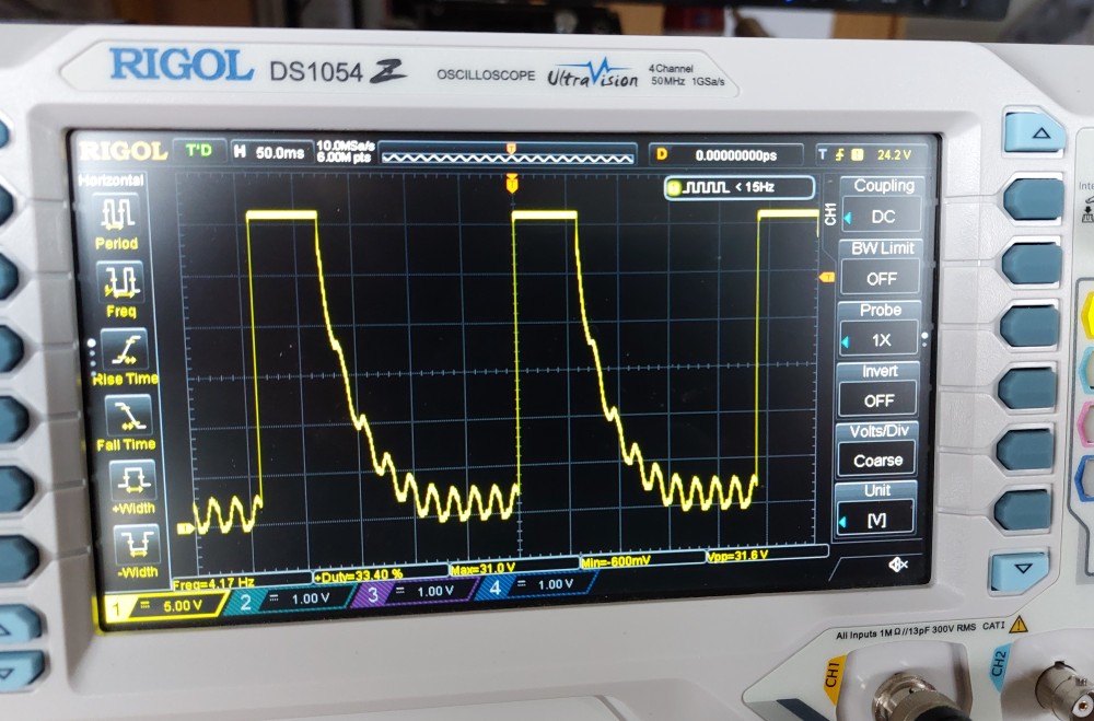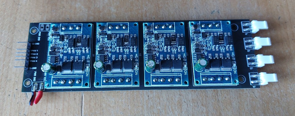 Apart from that, the first tests with just one module used were promising, so I went ahead and made a mounting PCB that could hold 4 of them. With 3 of those I could power 12 individual lights or devices. Unfortunately, just slapping together multiple did not go as planned. I suddenly had huge ripple on the output and never quite understood where that came from (my best guess is the capacitors charging and discharging back and forth).