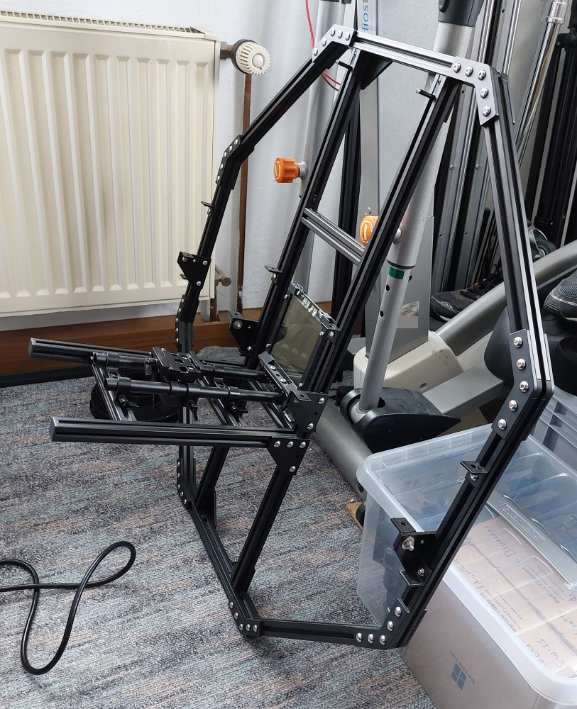 Pretty straight forward. Linear rails, 2020 and 3030 Aluminium extrusions and a couple of flanges as rotation points on the sides.