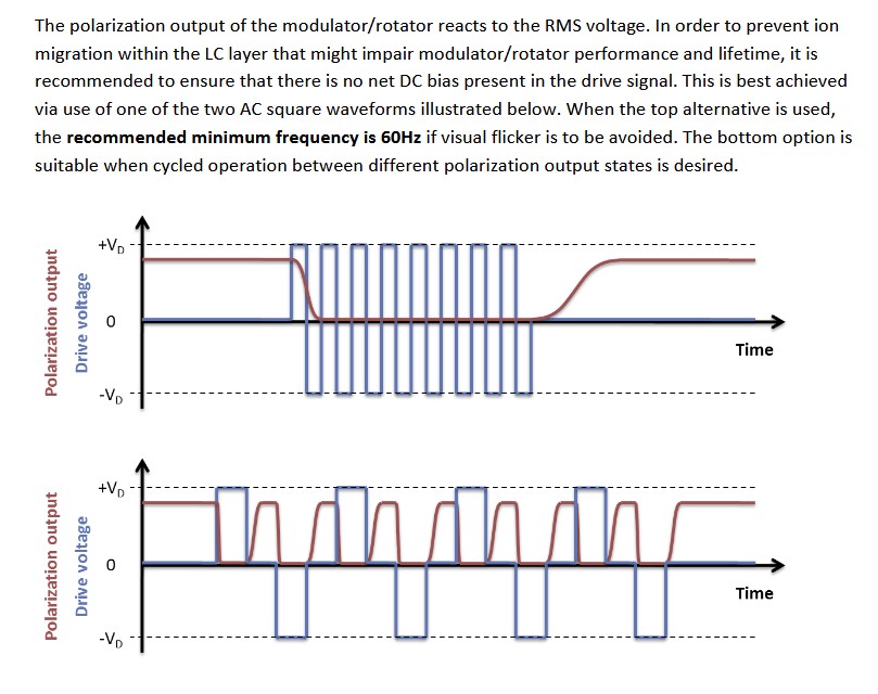 The original welding helmet controller ran the LCD on 45Hz. That sounds really low, but it is a matter of the how fast the LCD reacts and how quick the relaxation time is. The documentation of LC-tec's FPM below has a nice image to explain that. Still, I'm running mine at 100Hz for good measure.