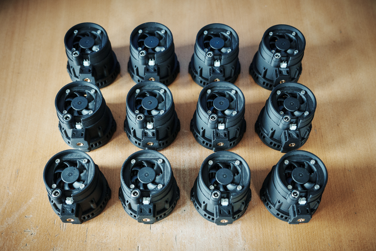What is relevant in any case though is getting rid of the heat. I was worried I could not properly cool the 40 W over the time of the shoot, and I would only know if it was good enough if I tried it out with a finished light. So, being who I am, I looked for the biggest heat sink I could fit in the space I was willing to design for, completely ignoring that metal has weight... foreshadowing! Later, closer to finishing the design I also added a little fan add-on to make sure I could cool the lights inbetween sessions if necessary.