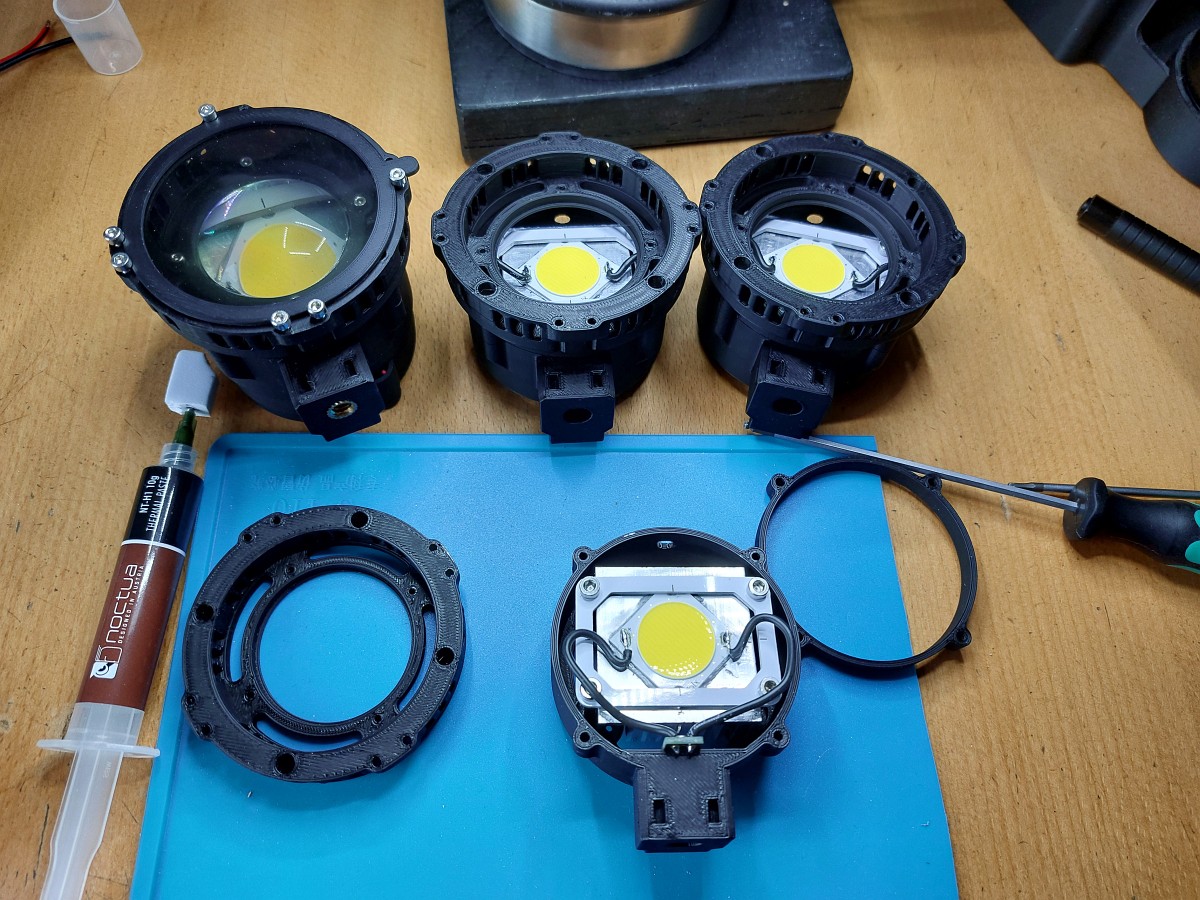 Being limited to permanent light sources, the obvious choice is LEDs. I had no idea how much power I should aim for, but browsing through the available options at my go-to electronics shop, I ended up with a 40-ish Watt high CRI led chip (CRI = color rendition index, basically how good the colors of objects come out). As a rule of thumb: the higher the CRI, the lower the light output per watt, which is why super bright LEDs usually have a rather crappy CRI rating and why power draw isn't telling the whole story.