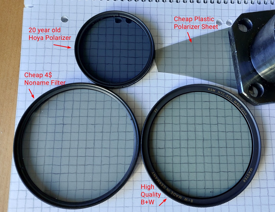 Later, however, I found that the cheapest shittiest glass polarizers for 4 $ on aliexpress are remarkably good for the purpose I was needing them for. They have no coatings, the threaded housing is absymal and I would never put them on any of my camera lenses... but they are perfect for the lights. I can't see a difference in cross polarisation performance, the transmission is about as good as my very expensive B+W filter, and in terms of color tint and neutrality they are more than good enough. So, highly recommended from me. Compared to the polarizer sheets, I get a bit more light out of them and they are much more scratch resitant - which often is a problem with the flimsy brittle plastic sheets.