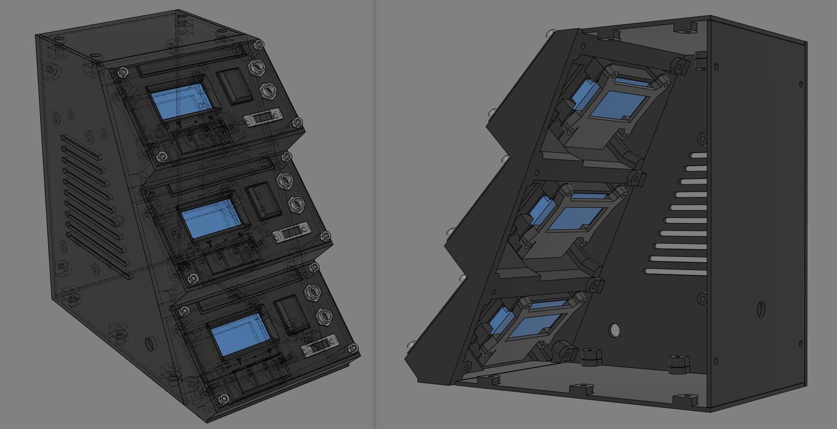 I went with a Quickcharge 2.0 / 3.0 control board and three QC trigger modules. The modules needed to have the USB connectors desoldered with a hot air gun and unfortunately the LCDs are only readable from below - that's how the christmas tree design was born. All in all I'm quite happy with it but I would probably go with 3 dedicated controllable buck converters next time. There are either 4ish, 5, 9 or 12V in QC 2.0 mode or between 4 and 12V in 0.2V steps in QC 3.0 mode.
