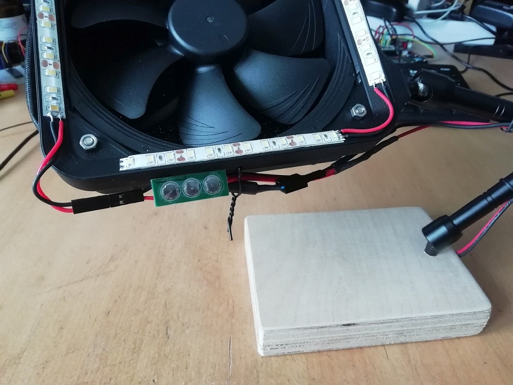 Surprisingly though, the fan - severly undervolted to 9V - still manages to suck in fumes from 20 cm distance without any problems at all. Probably could be even farther away, but 20 cm is my perfect working distance with the light. It's of course also helping with the noise (it's after all considerably louder than a regular PC fan).