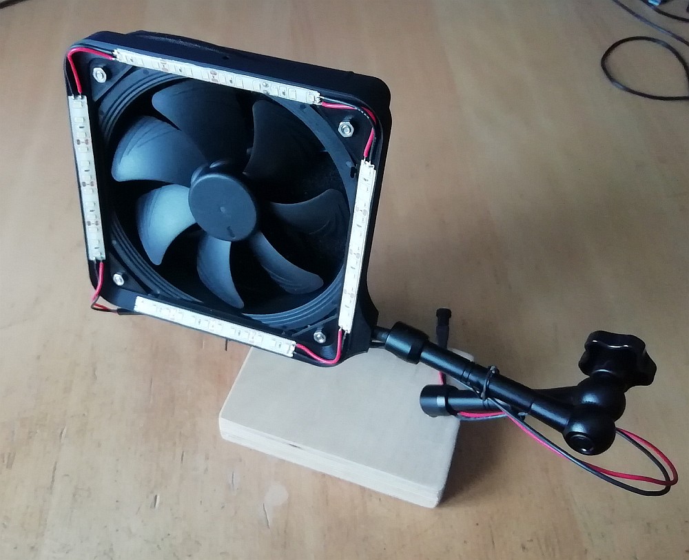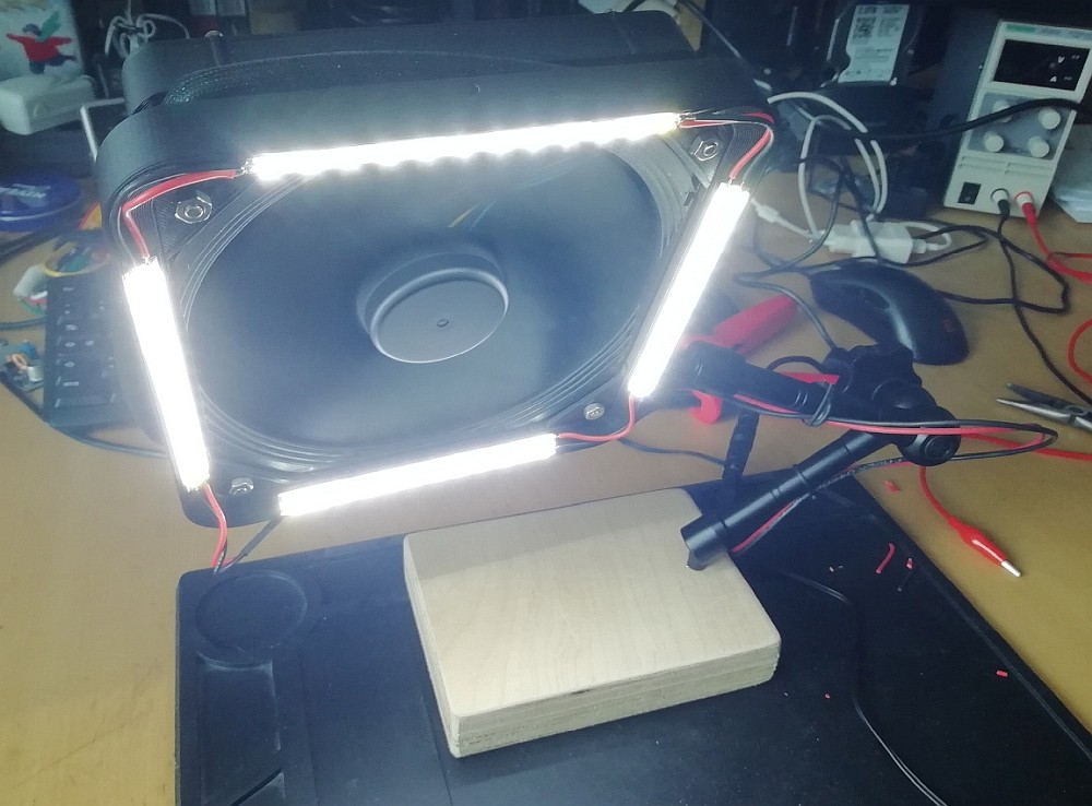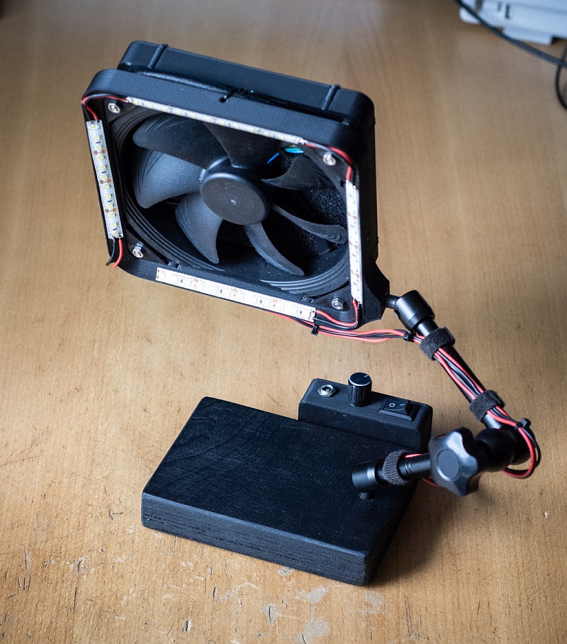UPDATE: I've added a switch for the fan and a PWM controller for the LEDs (removed the old one). It's way more useful as a general work light now and also looks a bit better. I also painted the base black.