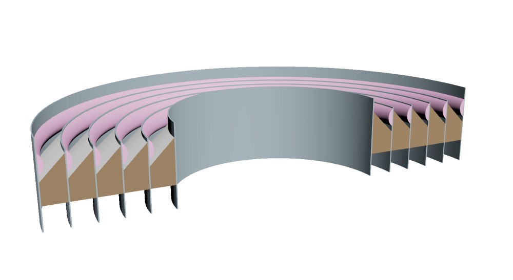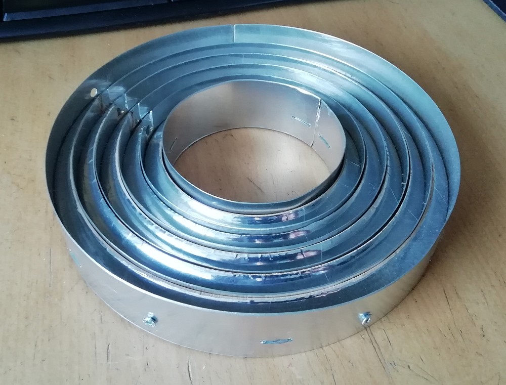 The housing is made of aluminium strips, held in place by turned wood rings, which were made reflective with aluminium tape (or something similar).