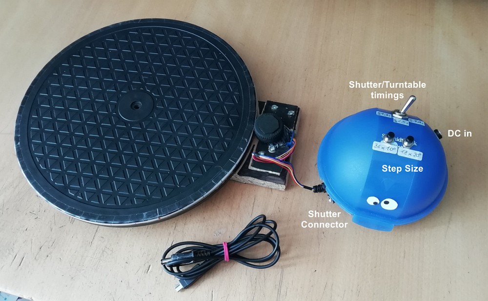 It's (almost) all parts from an Arduino Beginner Kit, so in theory you could even build it without soldering. The Arduino controls the stepper motor and a relay. The relay triggers the DSLR using a disassembled cable trigger. A switch was used to define the time the Arduino has to wait for the camera to finish and to continue rotating the platform. Two start buttons let you chose the number of pictures to take (basically the number of divisions of the 360° rotation).