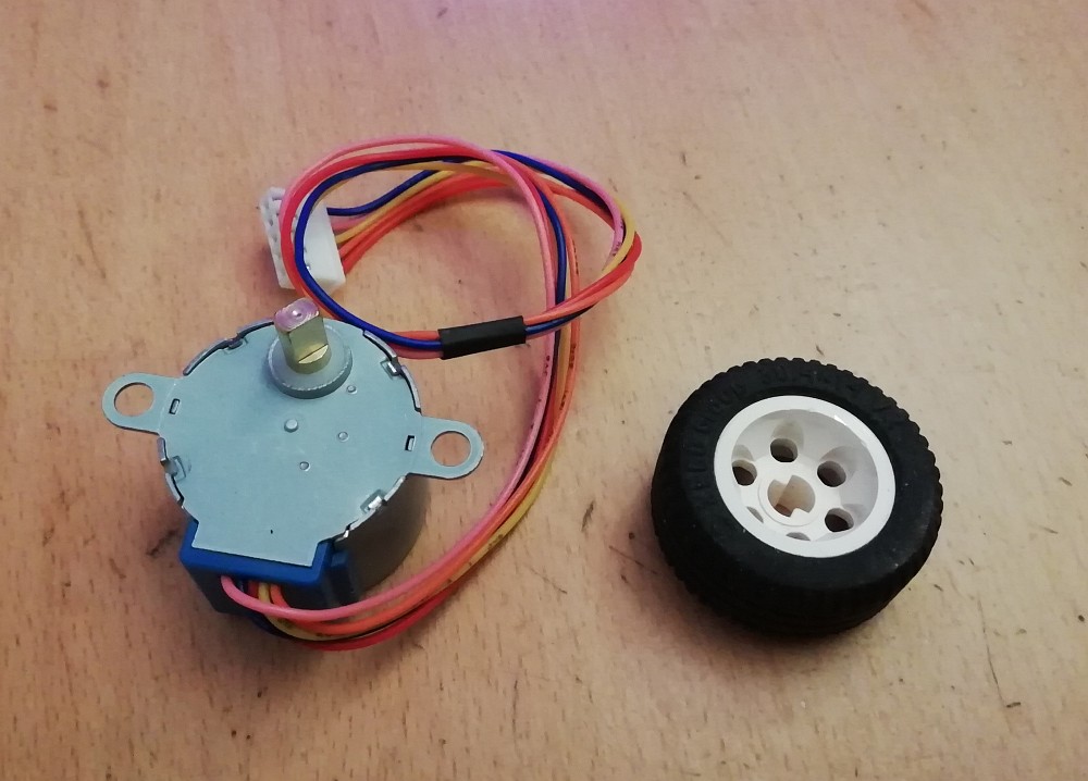 Fortunately, an old Lego tire fit perfectly on the small stepper motor shaft, so the only thing left to do was drilling some holes into a "Hama" plastic turntable and attach it and the motor to a wooden base plate.